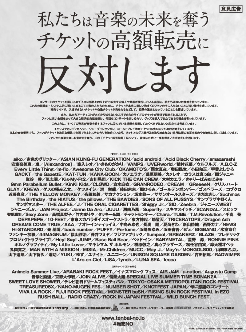 スポーツイベント業界はあまり詳しくないので、コンサート系を前提にお話しますが、今では主催関係者やイベンター、オークションサイトもいろいろな対策をとっています。価格設定の調整、個人認証システム、交換システムの構築、転売サイト監視、大量出品者へのアカウント規制などを行っています。2016年にはコンサートプロモーター各社が連名でこのような新聞広告を出していたこともあります。